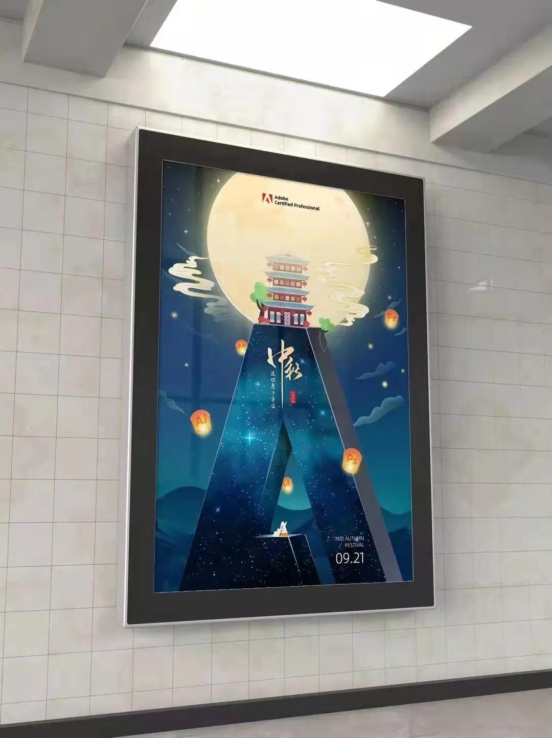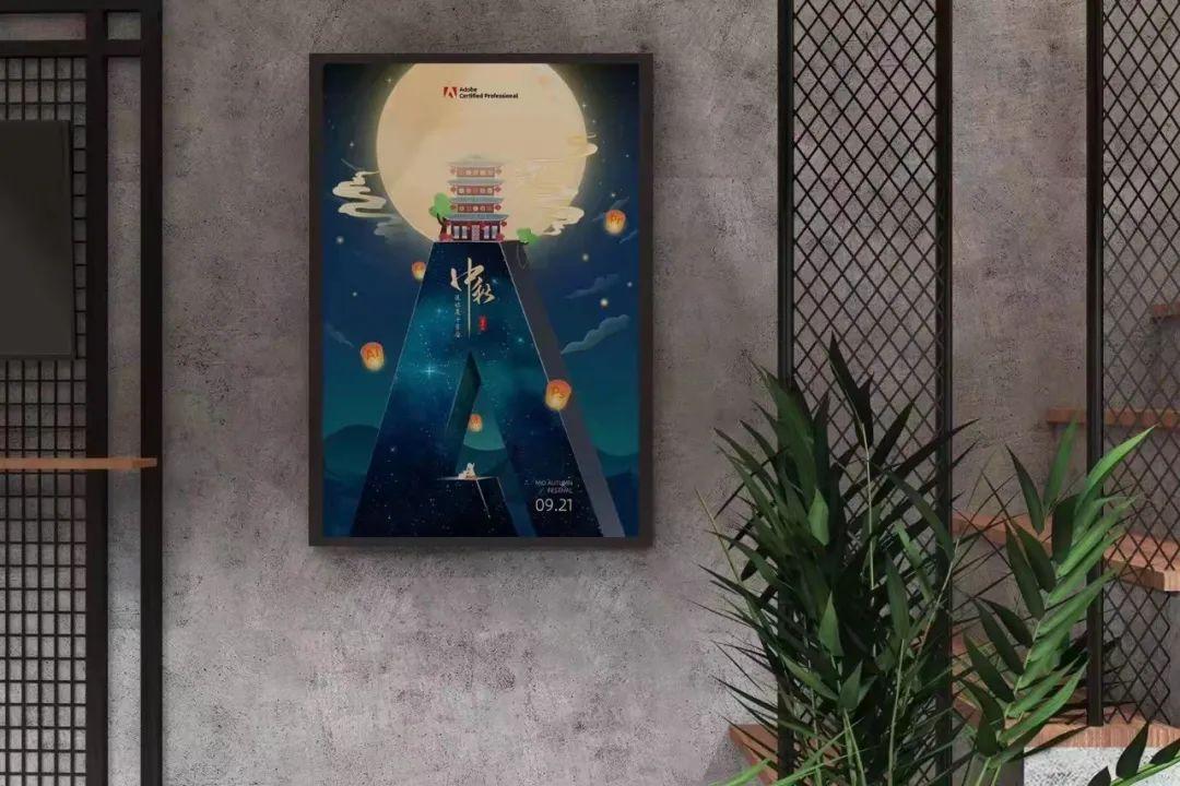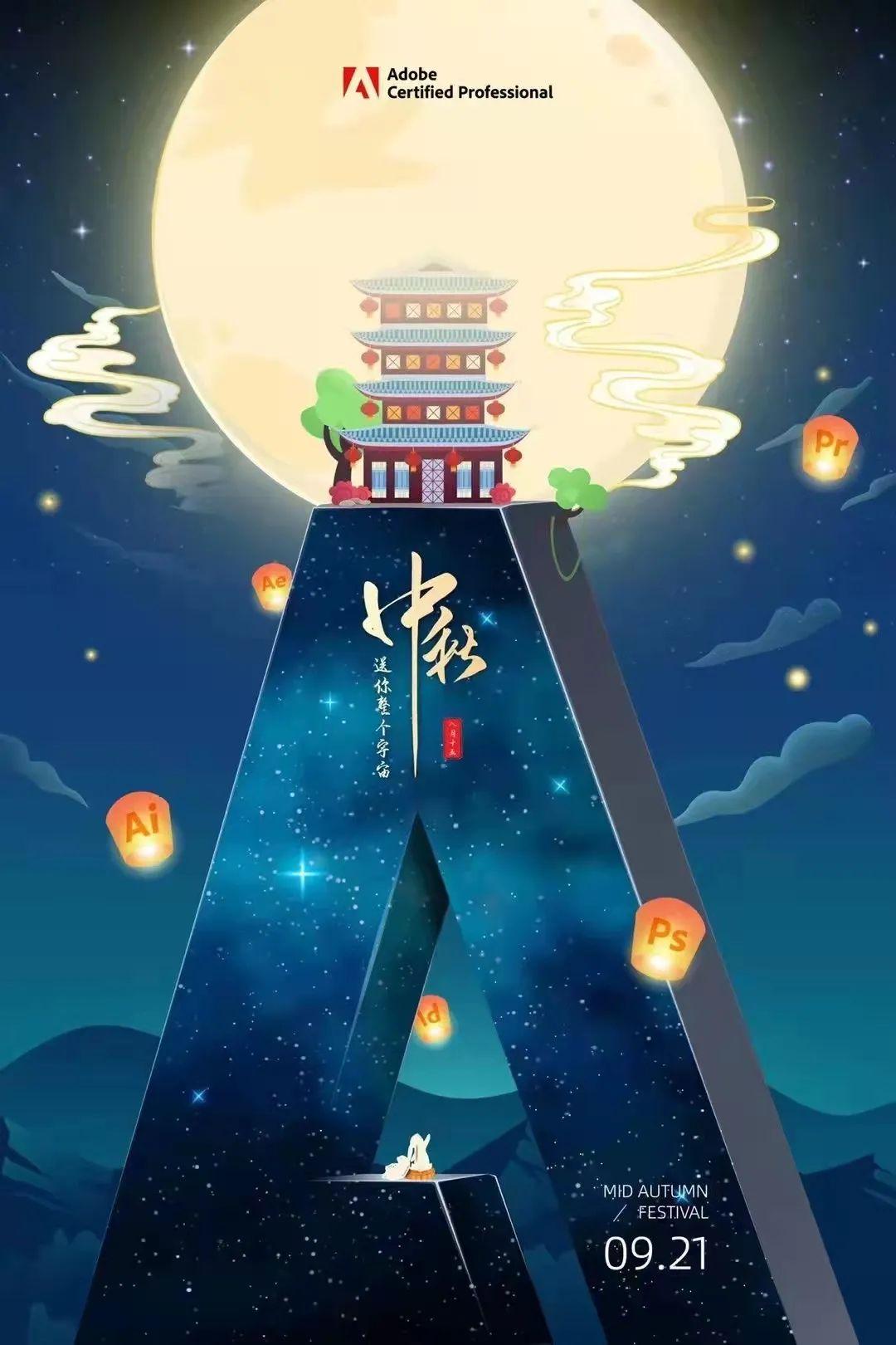 品牌的节日海报不仅仅要体现“中秋”的主题,更要和品牌相结合。所以用Adobe的logo做成一座装载着宇宙的山,代表着学无止境,跟文案相呼应。