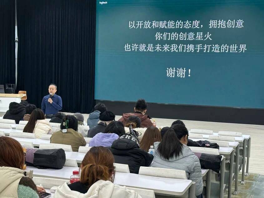 讲座开场,未来设计学院艺术与科技专业负责人刘泽斌老师率先登台。他结合学院的人才培养理念,提出:“设计专业的同学们常困在课堂作业与企业真实需求的断层里。这次ACP世界大赛把罗技这样的行业头部公司请进课堂,从设计视角拆解企业的用人标准,刚好补上了从校园到职场的衔接课。希望大家借这次机会摸清行业脉络,让专业成长少走弯路。”